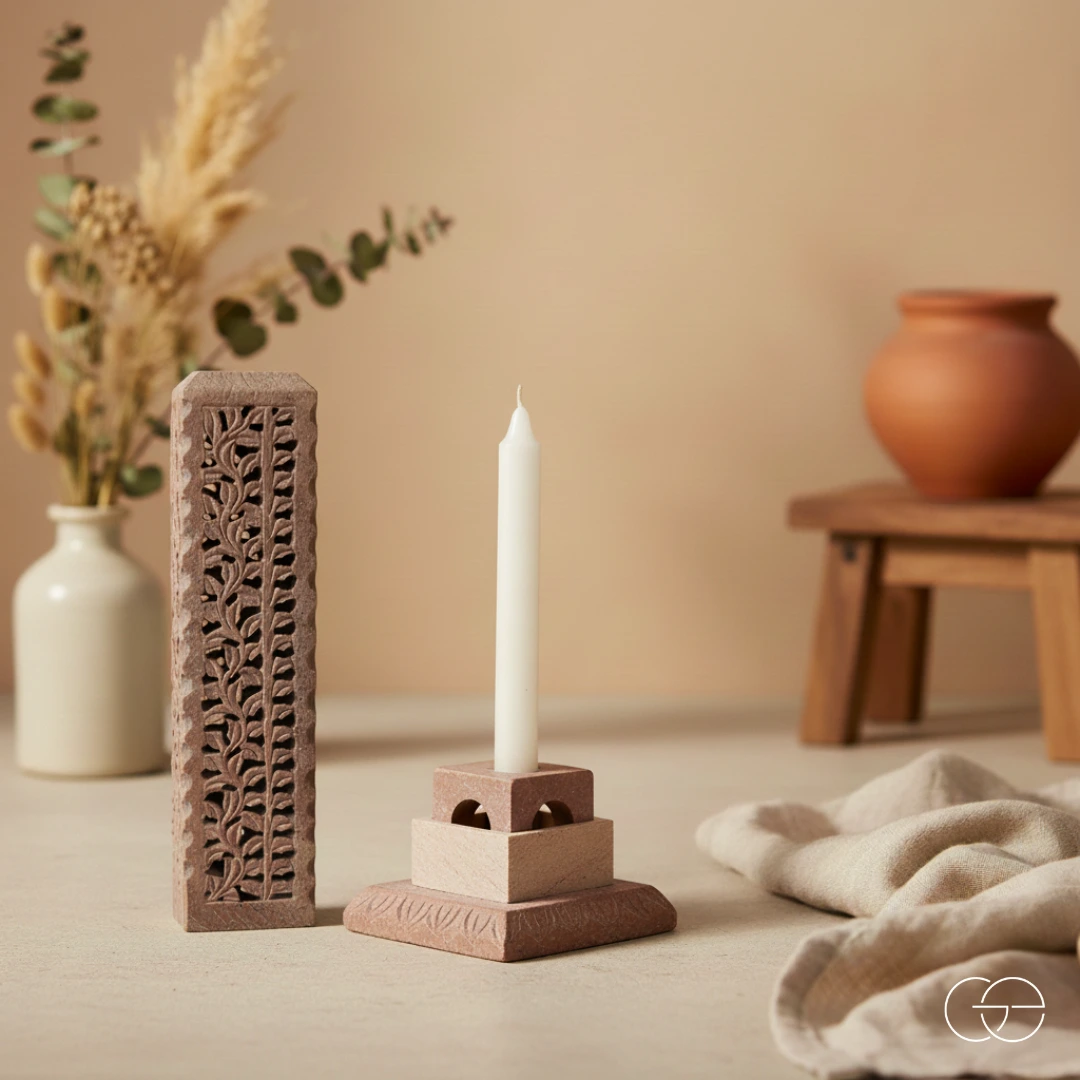 Elevate your home’s ambiance with our Hand-Carved Stone Incense and Candle Holder Set. Each piece in this collection is meticulously crafted from natural stone, featuring intricate hand-carved details that reflect timeless artisan skill. The set includes a versatile multi-tiered holder, adaptable for both incense sticks and slender taper candles, alongside a beautifully ornate incense tower. Its earthy tones and organic textures bring a sense of tranquility and natural beauty, making it a perfect accent for meditation spaces, living rooms, or any area seeking a touch of mindful elegance.