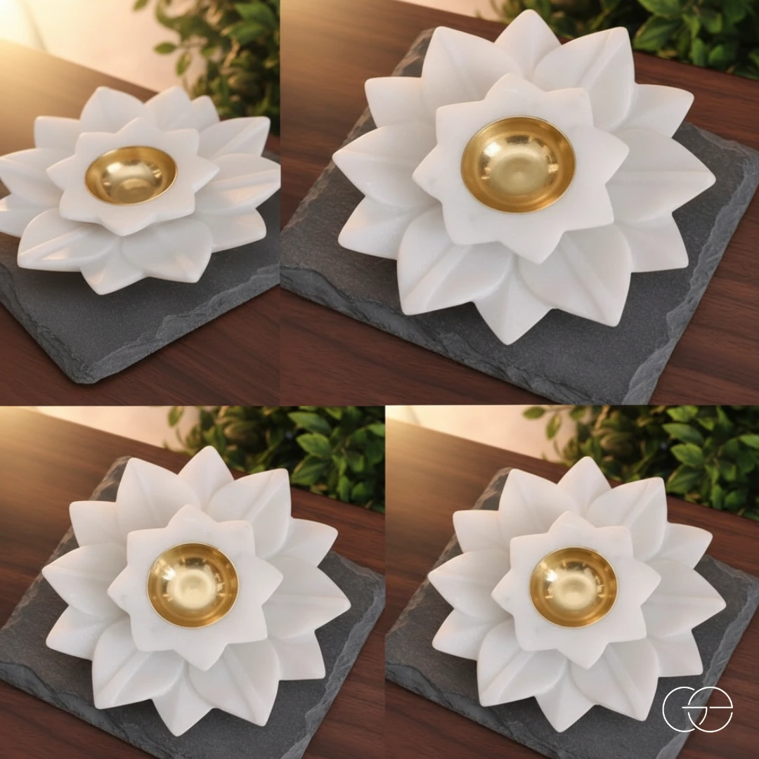 A beautifully crafted lotus-shaped holder made from white marble, featuring a central brass bowl perfect for holding a diya (oil lamp) or a tea light candle.
